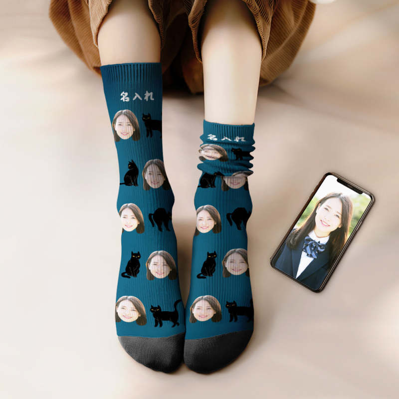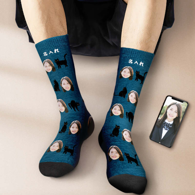 カスタムフェイスソックス-写真入れ名入れ可能な黒い猫柄のオリジナル靴下プレゼント