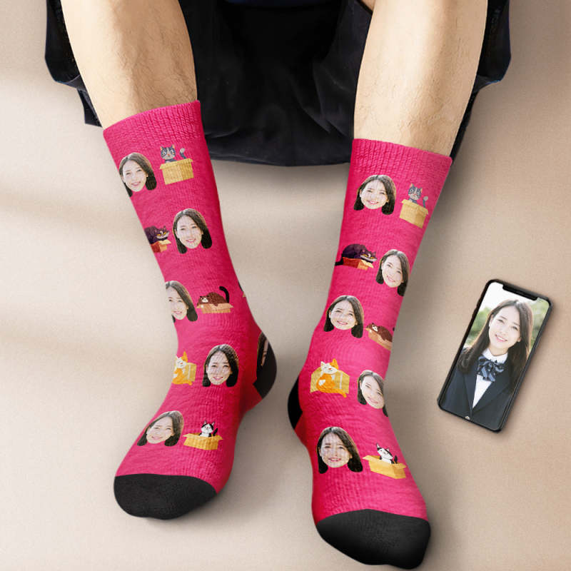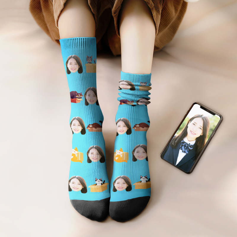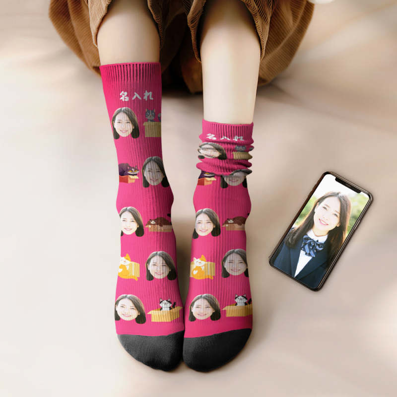 カスタムフェイスソックス-写真入れ名入れ可能な箱猫柄のオリジナル靴下プレゼント
