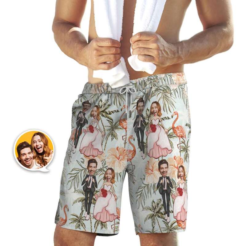 カスタムフェイスビーチショーツ-パーソナライズされた結婚式サーフパンツ-フラミンゴとココナッツ