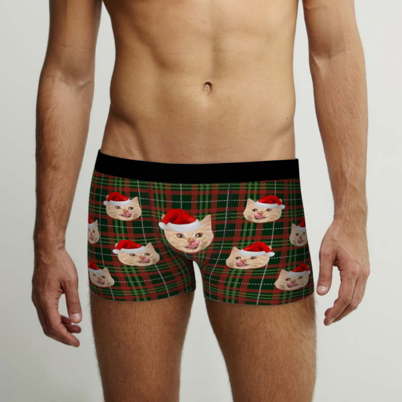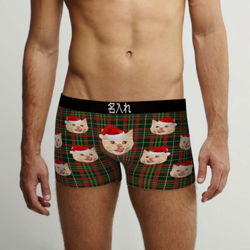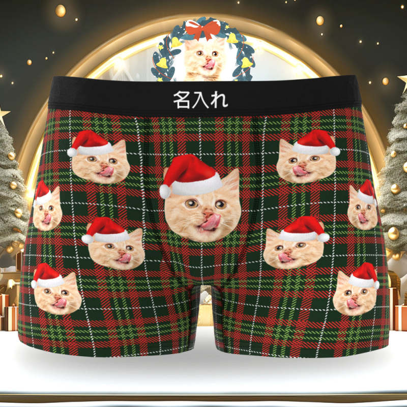 カスタム顔ボクサーパンツ-顔の写真入れ可能なオリジナルフォト下着ショーツクリスマスギフト-クリスマスチェック柄
