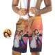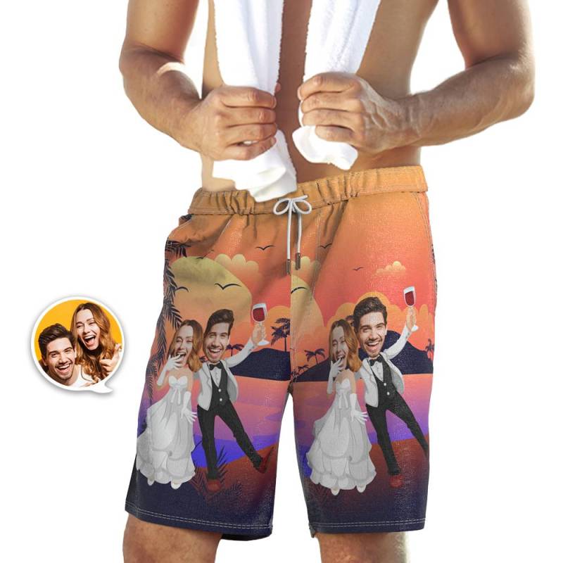 カスタムフェイスビーチショーツ-パーソナライズされた結婚式サーフパンツ-サンセットとココナッツ
