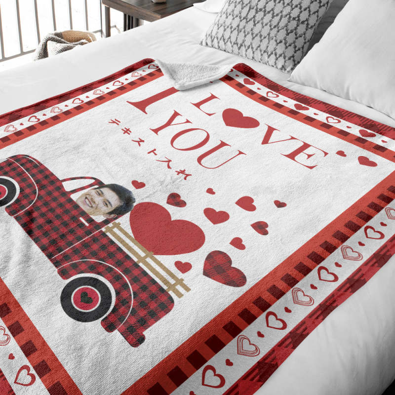 カスタムフォトブランケット-写真とテキスト入れ可能な愛を満載したトラック柄のフリース毛布好きな人へのバレンタインひざかけギフト カスタムフォトブランケット-写真とテキスト入れ可能な愛を満載したトラック柄のフリース毛布好きな人へのバレンタインひざかけギフト