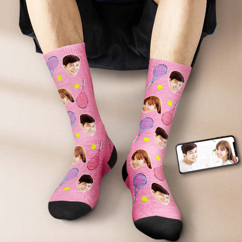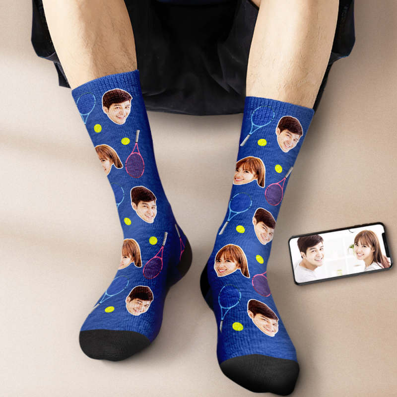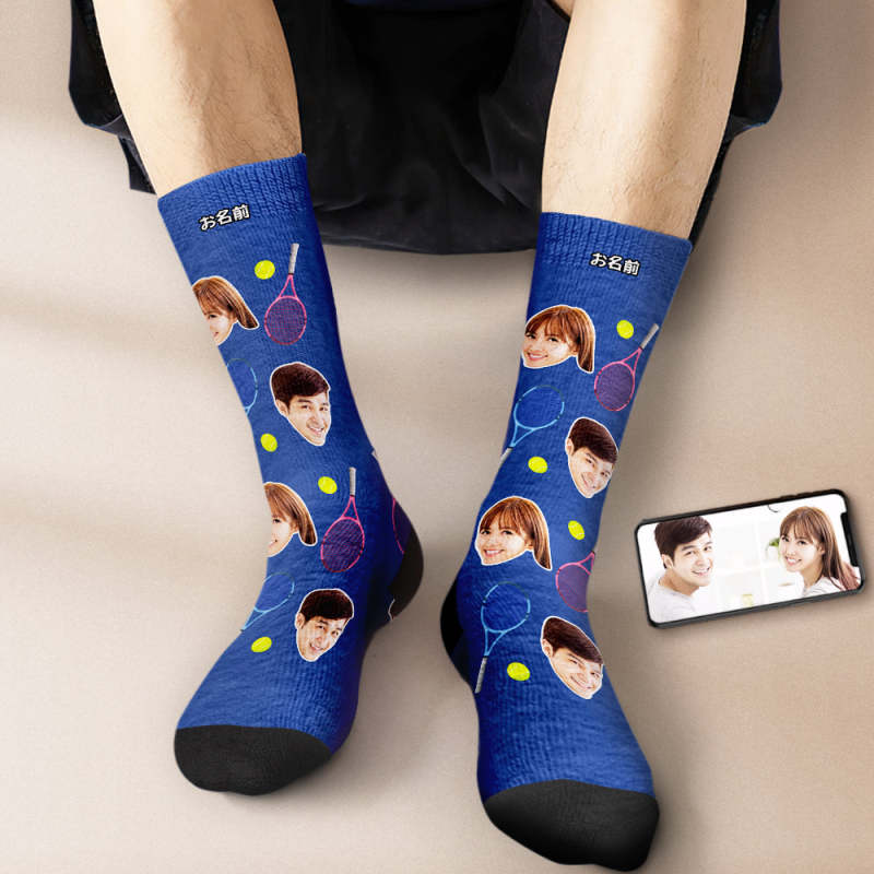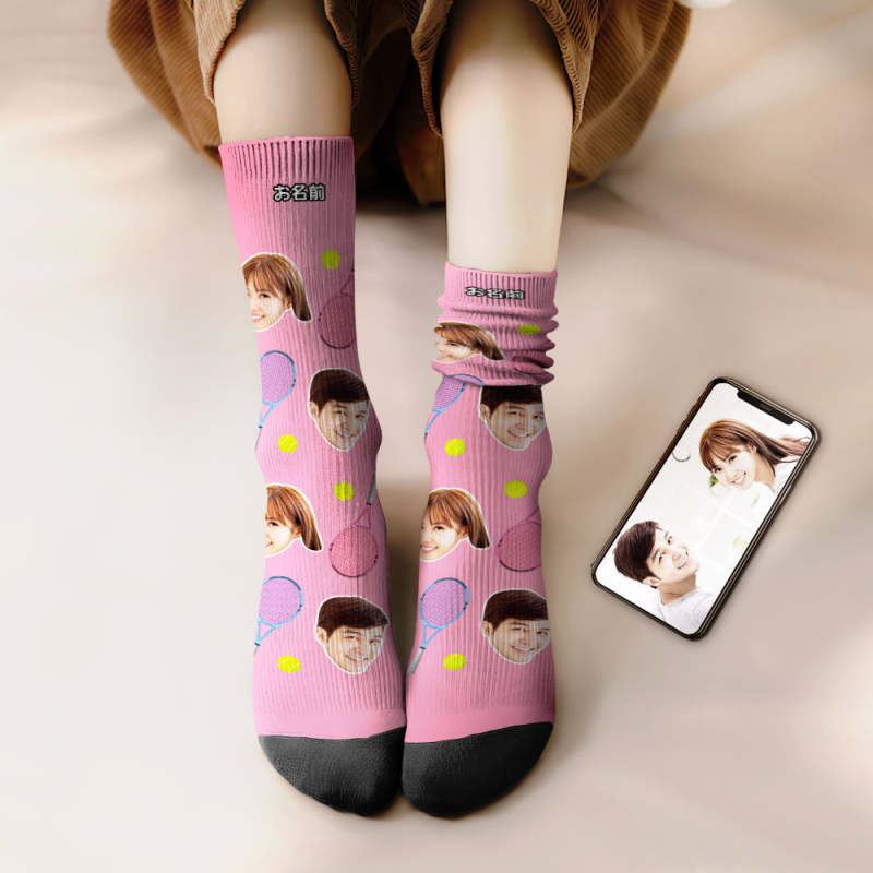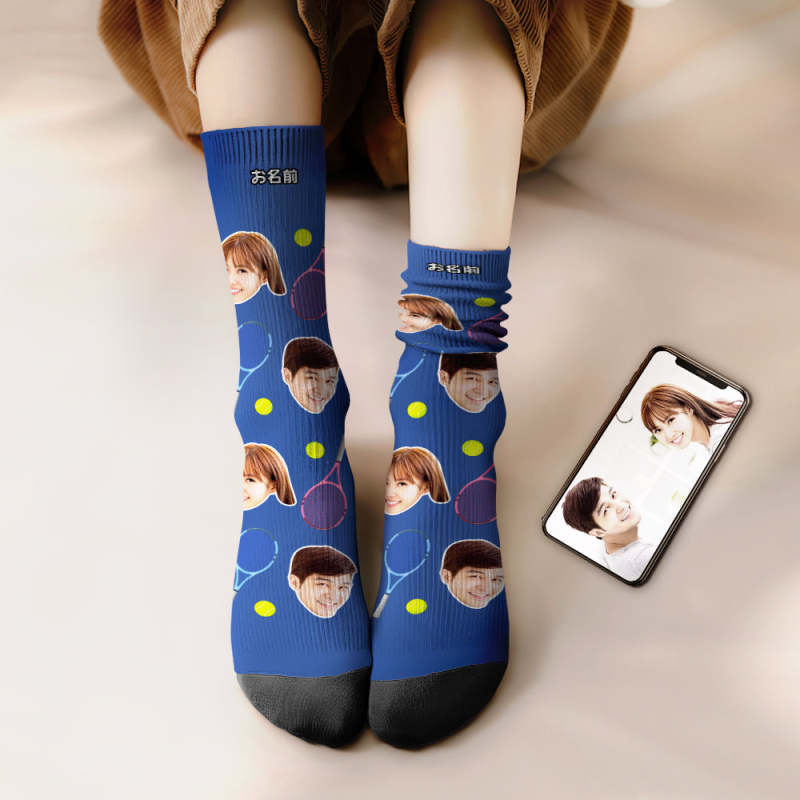 カスタムフェイスソックス-写真入り名入れ可能なテニスラケットとボール柄のオリジナル靴下プレゼント