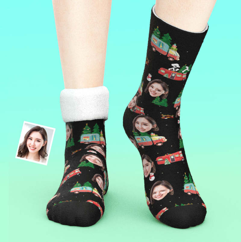 カスタム厚手フェイスソックス-ペット写真入れ名入れ可能なクリスマスツリーと車柄のオリジナル秋冬用暖かいクリスマス靴下プレゼント