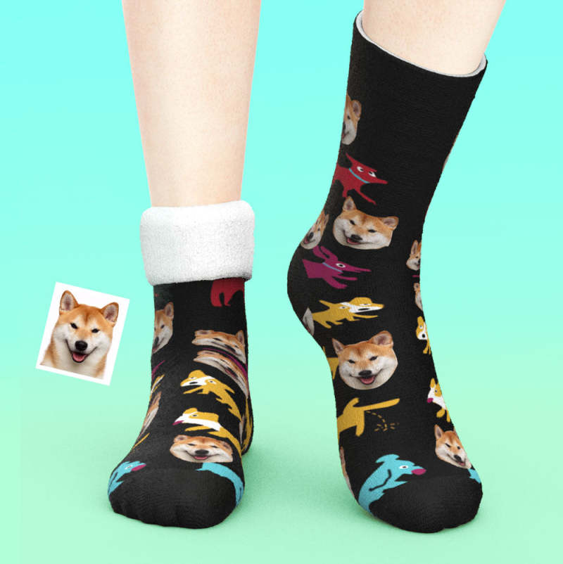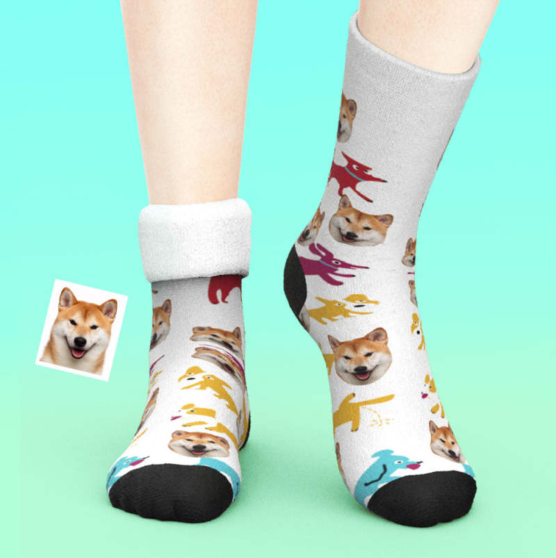 カスタム厚手フェイスソックス-ペット写真入れ名入れ可能な面白い犬柄のオリジナル秋冬用暖かい靴下プレゼント