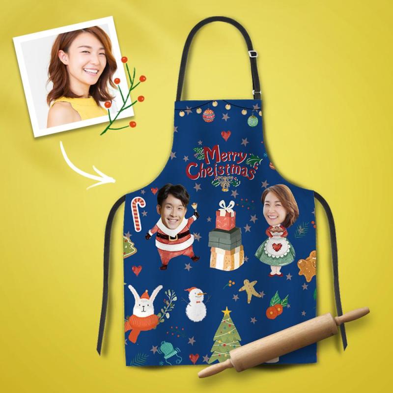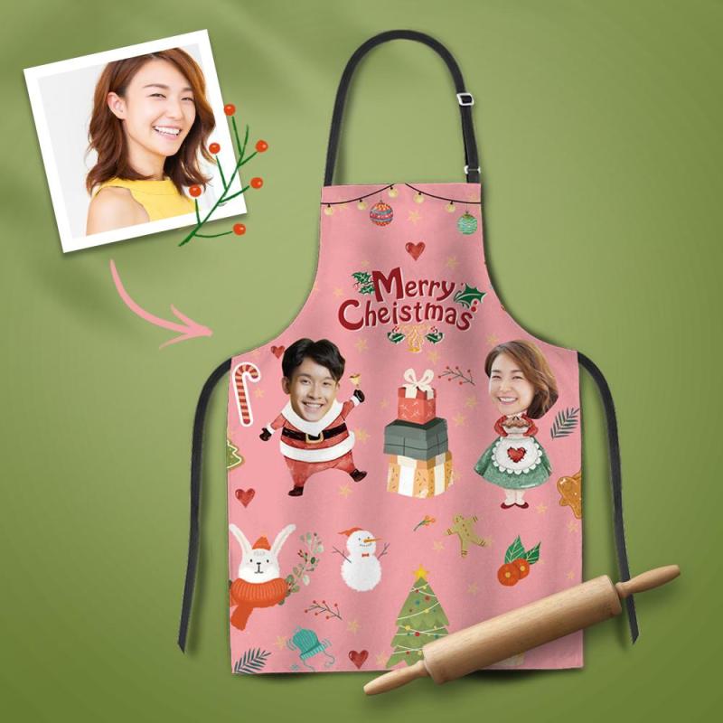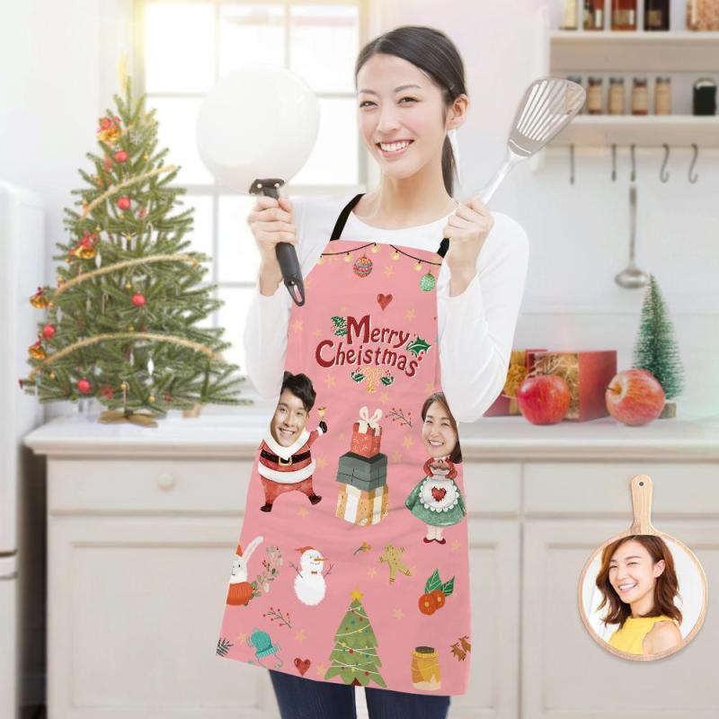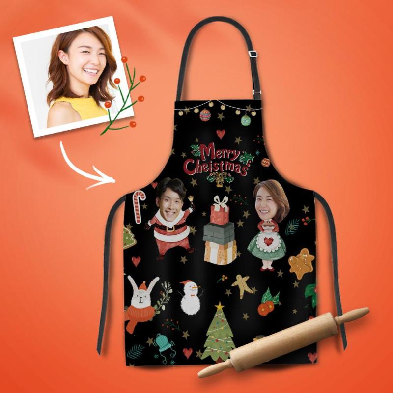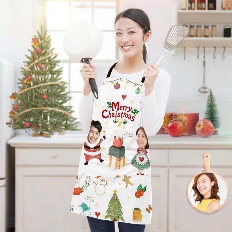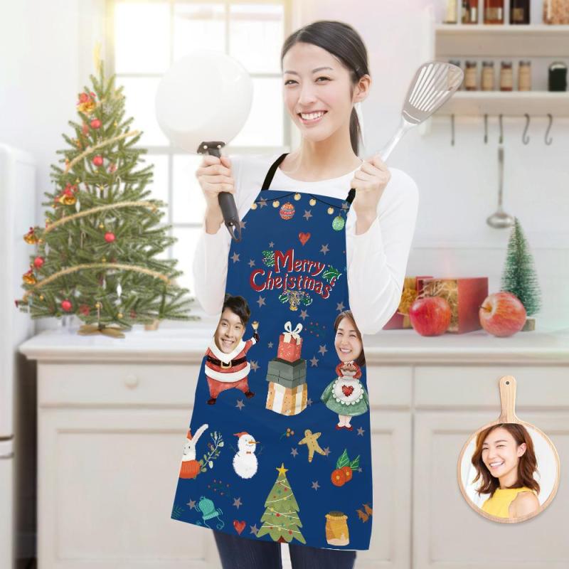 カスタムフォトエプロン-二つの顔写真入れ可能なキッチン首掛け式クリスマスエプロンギフト