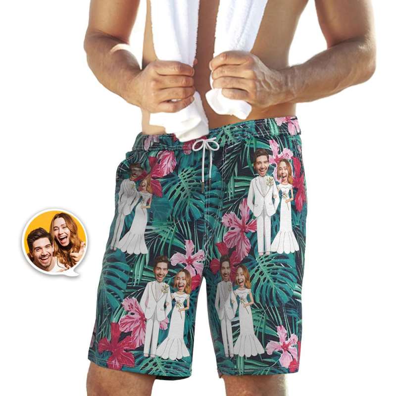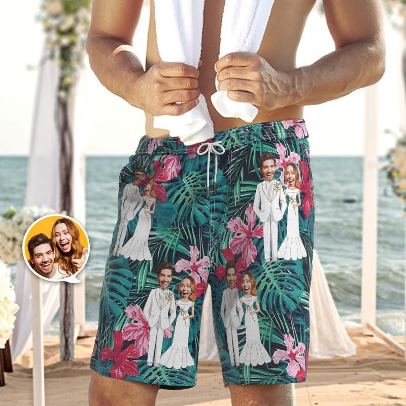 カスタムフェイスビーチショーツ-パーソナライズされた結婚式サーフパンツ-花柄